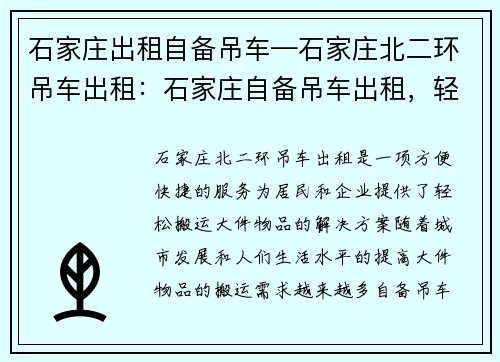 【开头】 连云港是中国东部沿海城市,拥有发达的港口和交通网络,是江苏省重要的经济中心之一。在这个城市中,二手小吊车成为了很多建筑、物流等行业的必备工具。而连云港二手吊车处理网车则成为了人们购买和处理二手小吊车的首选平台。本文将为大家介绍连云港二手吊车处理网车,帮助用户了解该平台的优势和使用方法。 【...